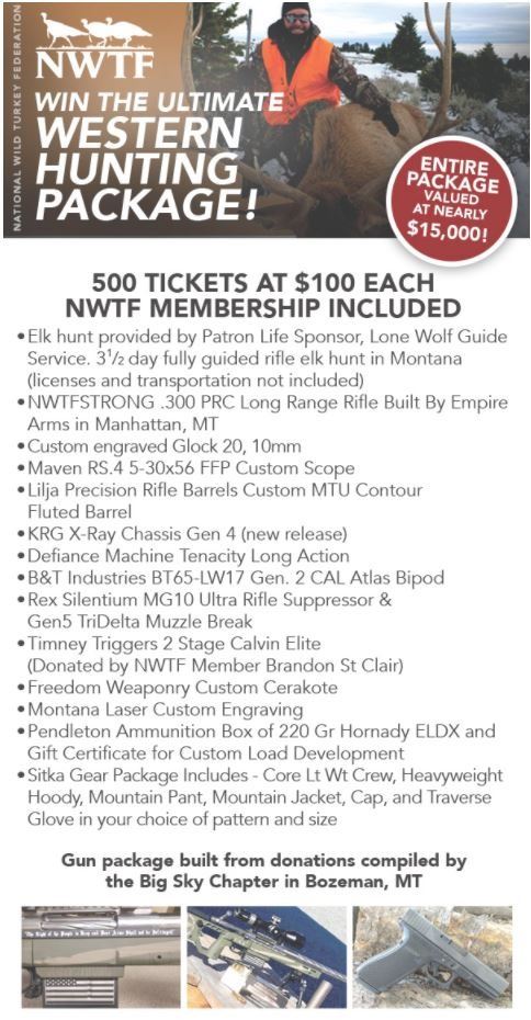 Elk Hunt provided by Patron Life Sponsor, Lone Wolf Guide Service. Three and half days, fully guided elk hunt in Montana. (Licenses and Transportation not included)