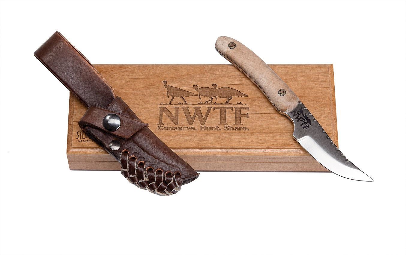 The Backwoods Pro Custom knife is craftsmanship at its finest. This handmade D2 steel blade with tiger maple wood* handle has extensive hand file work on the spine of the blade. Includes mosaic pins, an upgraded handmade leather sheath and wood display box with NWTF logo on the box lid. Lifetime warranty.