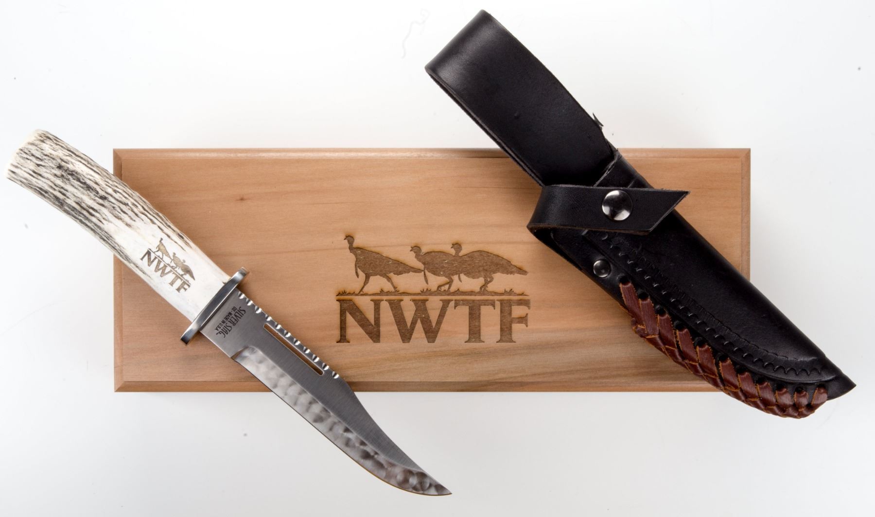 Silver Stag’s turkey camp knife is the perfect blade for the woods or as a centerpiece display at home. It features a 6-inch D2 steel blade with a hand-sanded and polished antler handle. Includes an upgraded leather snap sheath with alder wood logo display box.