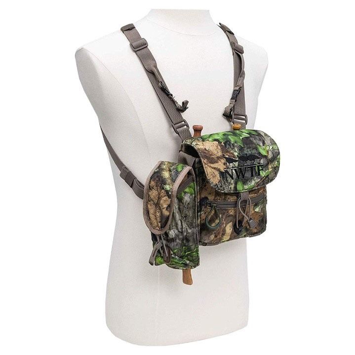 ALPS OutdoorZ’s run-’n’-gun style binocular harness with front U-shape design and adjustable closure allows easy access for a variety of bino sizes. The padded back panel accommodates one pot call and two strikers. A Molle system incorporated on one side and the bottom provide attachment points for a rangefinder pocket, box call pocket or other Molle accessories. Two side mesh pockets hold diaphragm calls and provide airflow to keep calls fresh. Comes in NWTF Mossy Oak Obsession.