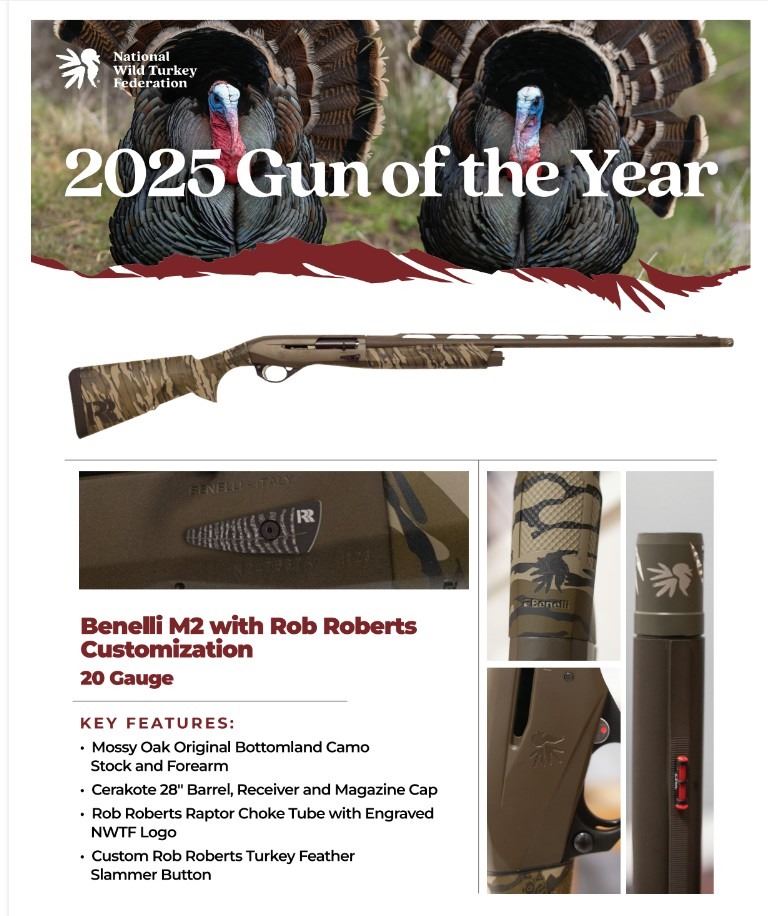 Benelli M2 Rob Roberts Custom 20 gauge NWTF 2025 Gun of the Year. This is a beautiful shotgun in mossy oak bottomland camo. Own an NWTF Gun of the Year!
