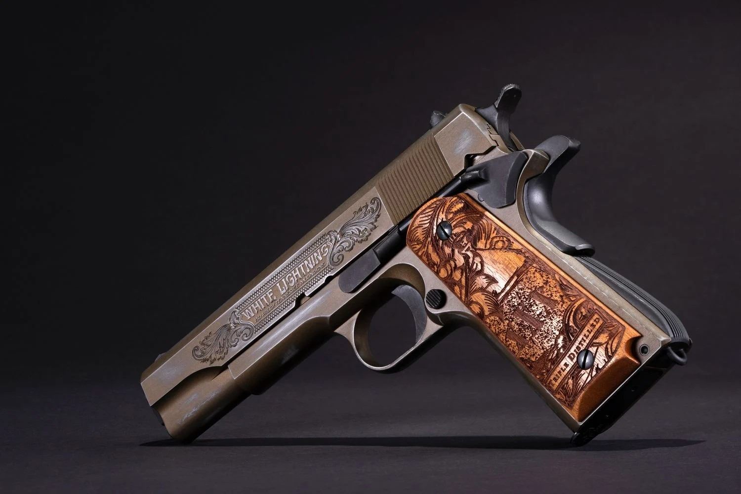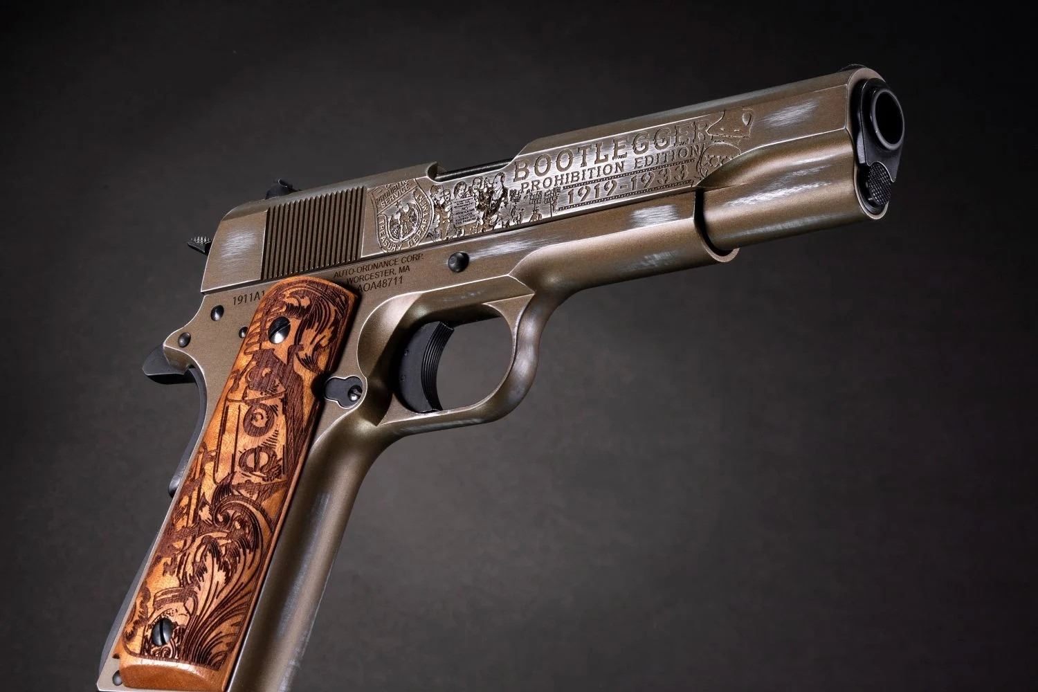 Auto-Ordnance commemorates the era with the “Bootlegger” 1911. This pistol is artfully engraved with depictions of 1920s historical images from the time.