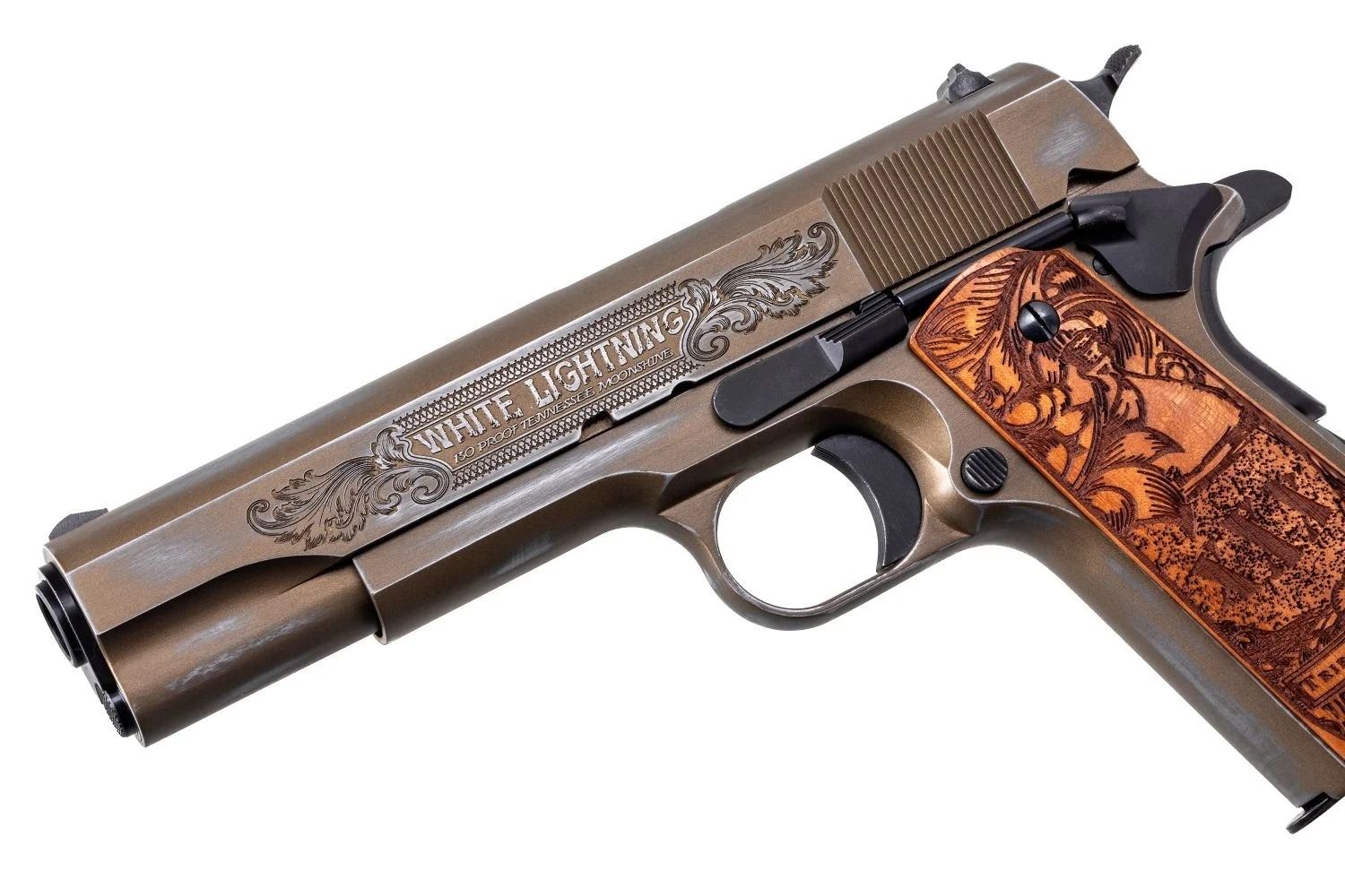 The 1911 slide is engraved “Bootlegger Prohibition Edition”, and “Proof Tennessee Moonshine”. Beautiful scrollwork covers the Walnut wood furniture, and sections of the steel. The finish is distressed Burnt Bronze Cerakote with a clear coating overlayed. The wood furniture is also distressed and then stained. The 1911 features a 5” barrel, and one seven round magazine and is chambered in .45 ACP.