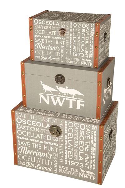 Central Line Set of 3 Trunks with NWTF Graphics-Need more storage for your camo? This set of three canvas trunks with faux leather trim will hold your valuables until hunting season arrives. Designed with NWTF graphics. Dimensions: 28.2" W x 17.3" H x 18.9" D (Large); 24" W x 14" H x 13.8" D (Medium); 20" W x 11.4" H x 11.8" D (Small)
