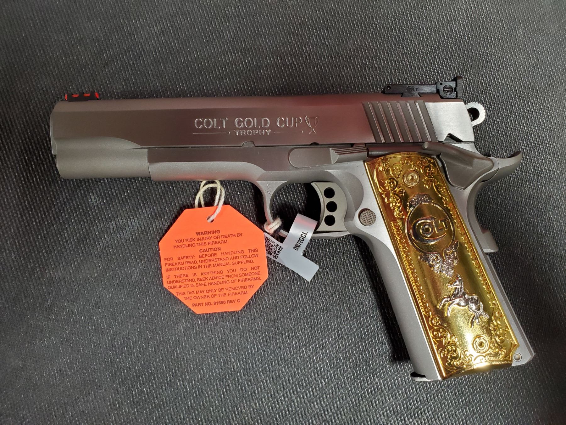 The Colt Gold Cup Trophy has been reborn as the ultimate choice for the modern competitor participating in any handgun challenge. True to it's legacy, the newly redesigned Gold Cup features what seasoned shooters want: 25 LPI checkering on the front and back strap, competition ergonomics, a beveled magazine well for easy reloading, adjustable rear sight, and those stunning Colt competition-blue G10 grips. For the weekend warrior rising through the ranks or the full-time competitive shooter, there really is no other option - the new Colt Gold Cup Trophy.