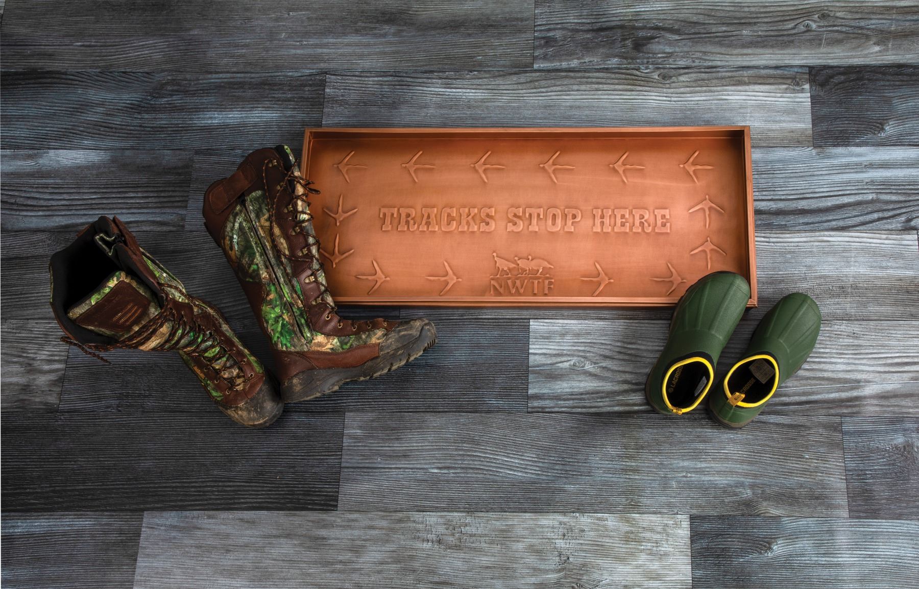 Your tracks stop here. The powder-coated, galvanized-steel construction of the custom NWTF Boot Tray comes in a stylish copper finish. The raised-relief design helps items dry faster. Matches all interior décor, and keeps your floors track-free. It’s also perfect for wet umbrellas or potted plants. Dimensions: 34” L x 14” W x 2.5” H