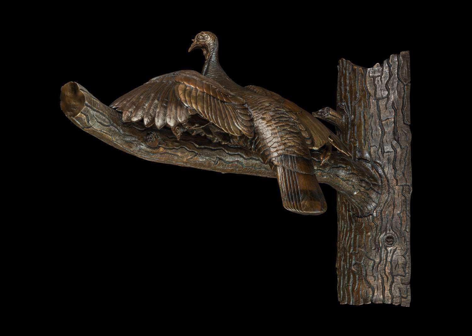 This sculpture depicts the mother turkey who, after incubating for 28 days, has successfully reared a clutch of eight turkey poults to the age of around three weeks old. It vividly depicts the protection a hen turkey provides her poults as they seek cover under her wings for the night. This sculpture will be offered in an edition of 49, representing one for every state with an established turkey population.