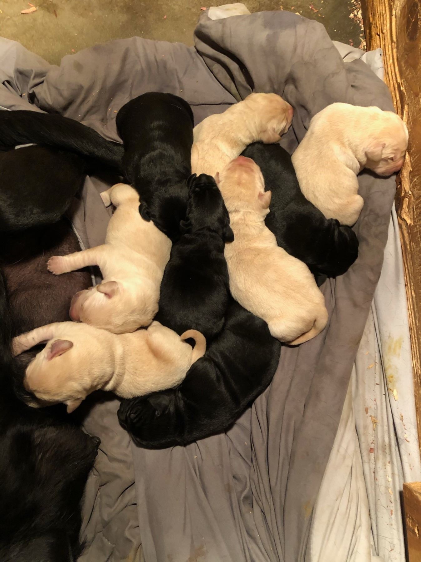 Females - 3 Yellow. Males - 2 Yellow and 4 Black. Master Hunter Certified Pointing Lab bloodline on Dam side. Canadian Grand Champion bloodline on Sire side.