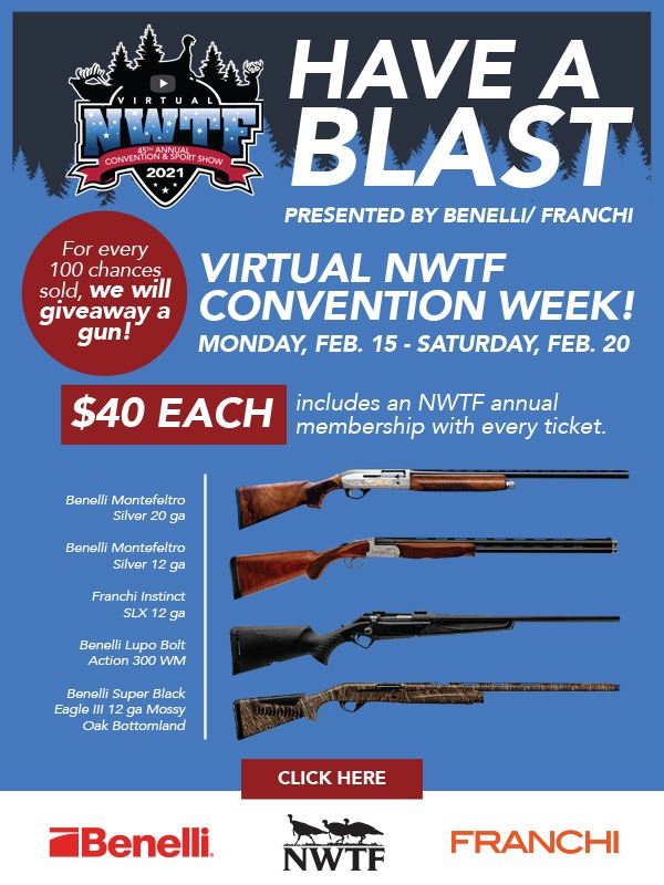 FIREARMS: Before taking possession of your purchased firearm, the gun must be registered in compliance with all federal, state, and local firearms laws. To meet this compliance, NWTF will ship the firearm, at the expense of the purchaser, from our FFL, Edgefield, SC 29824 to a Federal Firearms License (FFL) holder of your choice after convention if the buyer is not present at the convention. Sports Lure will be transferring firearms during and immediately after the banquet for those who are present.