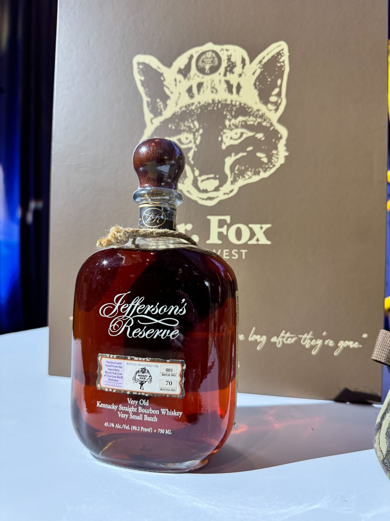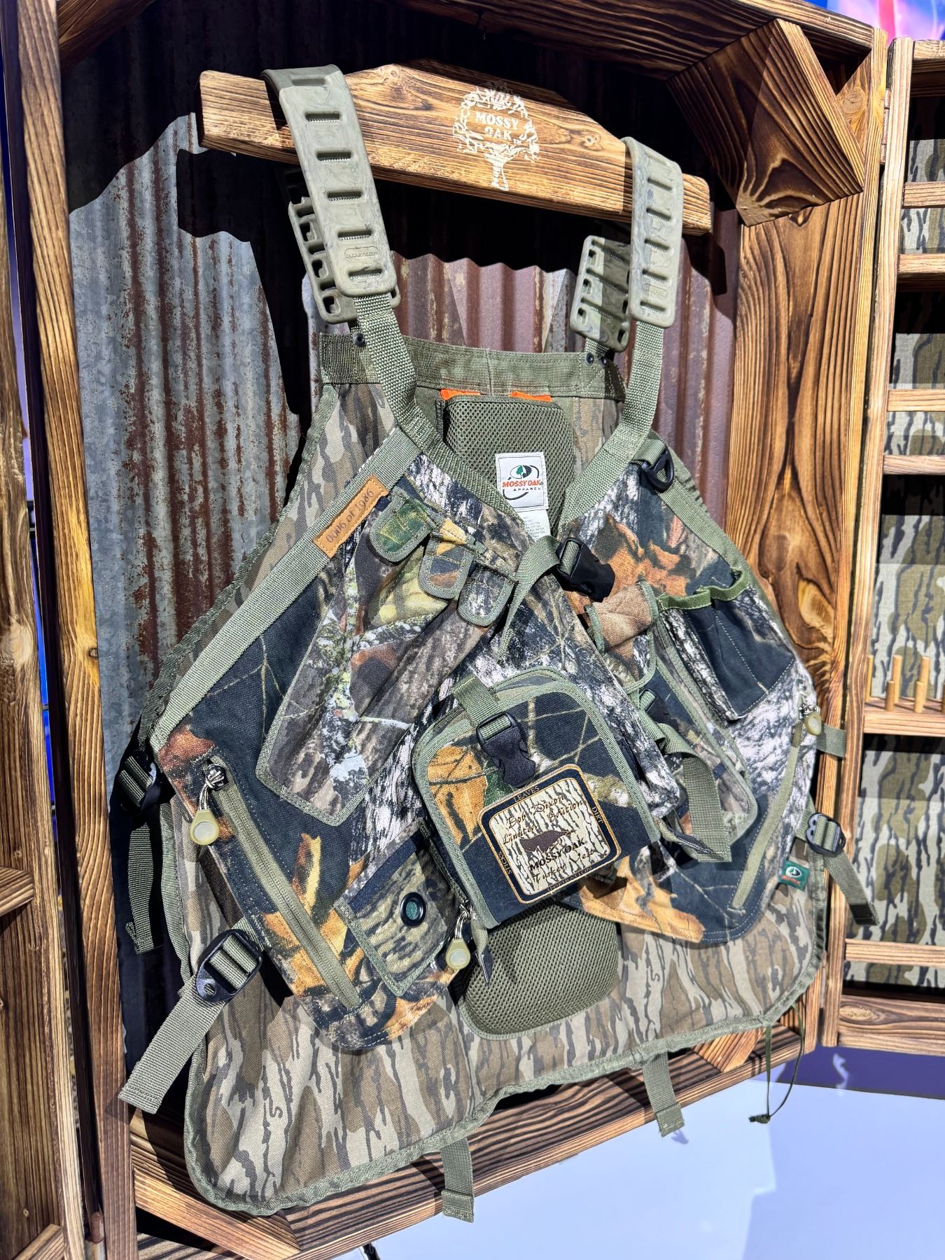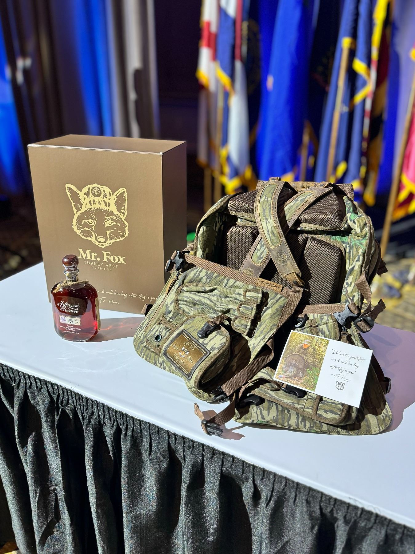 The vest is paired with the matching #70 edition bottle of Jefferson's Reserve Bourbon. This Bourbon was finished with wood from the legendary "MOSSY OAK TREE" of Choctaw Bluff Alabama. Mossy Oak owns every bottle of this special bourbon and none of the bottles will ever be sold. A limited number have ever been released to help raise money for conservation.