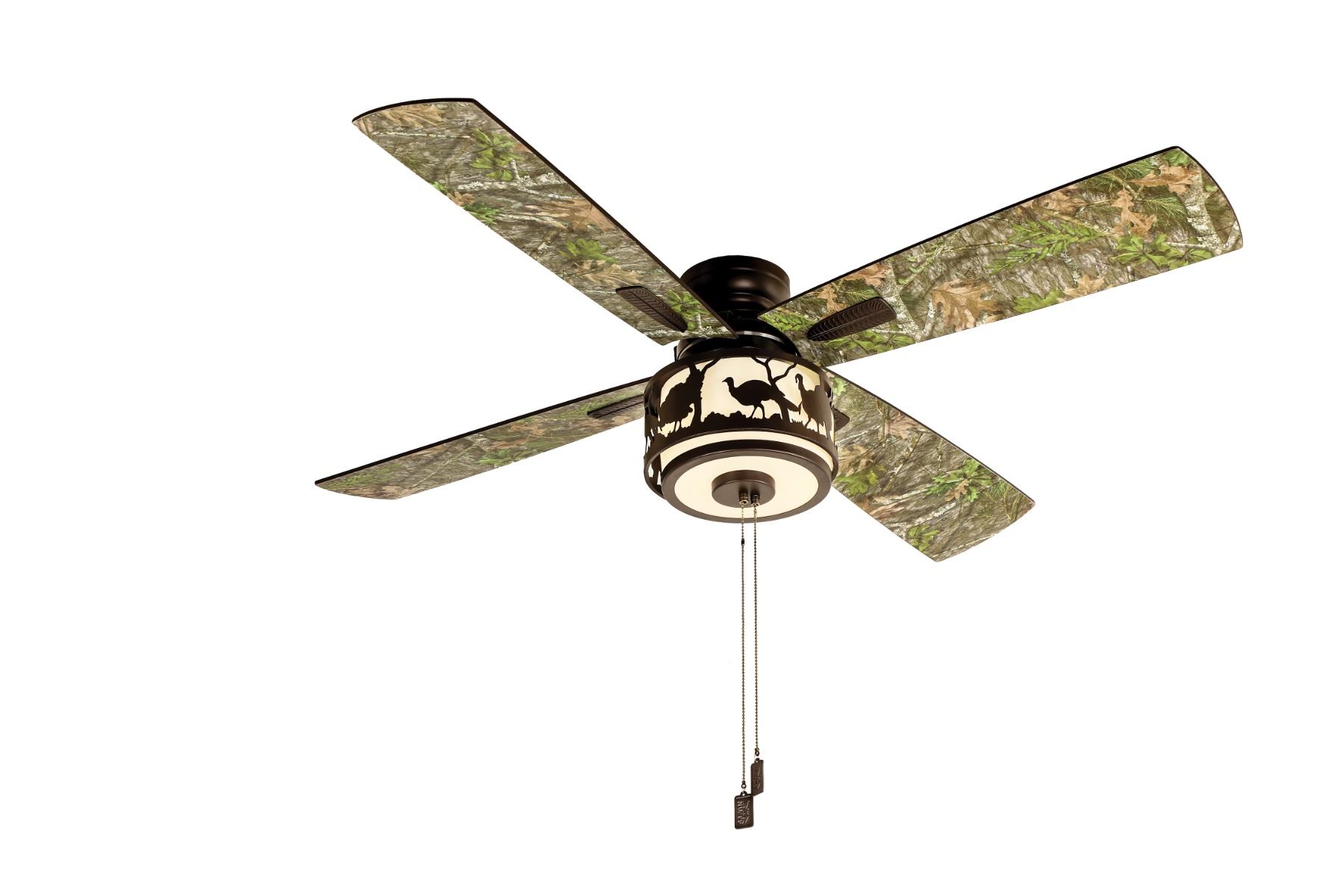 This custom NWTF ceiling fan showcases walking turkeys in metal around the center light fixture. Reversible blades with tail feather hardware lets you choose between NWTF/Mossy Oak Obsession or a distressed barn wood pattern.