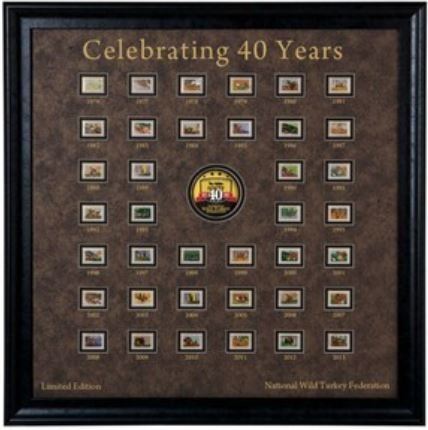 NWTF 40th Anniversary Stamp Print displays cloisonne replications of every NWTF Stamp from the 1st in 1976 thru 2013. It is a limited edition of 1,950 and measures 31" by 30".