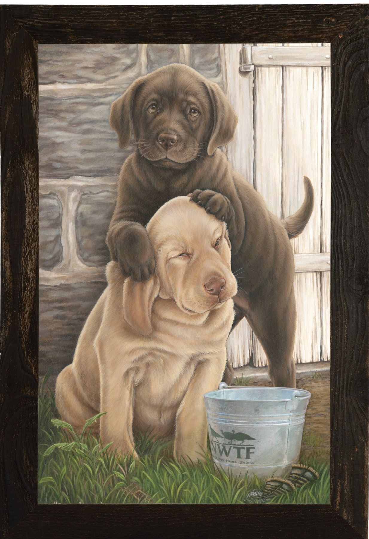 Dog lovers unite. They may be up to no good as portrayed here in Melissa Ball’s giclée, but it won’t be long before they’re hunting and retrieving birds afield. Edition: 1,500