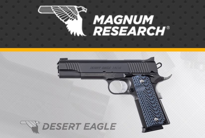 • Magnum Research Desert Eagle 1911 G - A Magnum Research .45 ACP Government model 1911, 5" barrel, carbon steel, black, fixed sights, two 8 round magazines, skeletonized hammer, extended magazine release, extended thumb safety, checkered mainspring housing, stainless steel full length guide rod,G-10 grips, 3-4 pound trigger pull, 36.2 oz. Includes matching 1911 Knife with fixed blade, 9.375” long, 420 stainless with G10 grips and Kydex sheath. www.magnumresearch.com