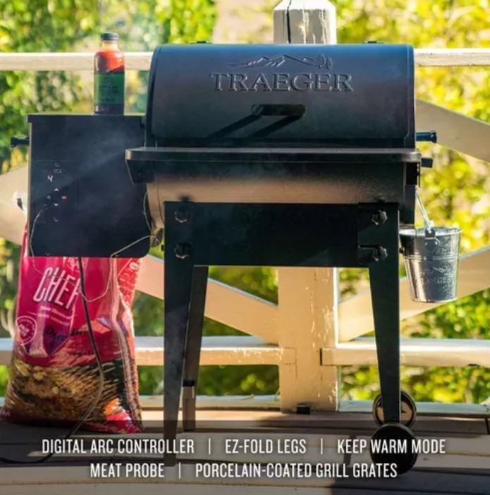 Traeger Tailgater includes: Grill, Grill Cover, Front Shelf, Grill Tools (Spatula, Tongs, Pig Flipper, Grate Cleaning Brush), 4 bags Pellets, 6 BBQ Rubs, 4 BBQ Sauces, Traeger will ship directly to buyer/winner.